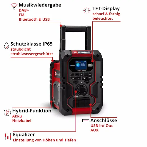 Das Einhell Akku-Radio TE-CR 18 Li DAB+/FM/BT überzeugt durch flexible Energieversorgung via Power X-Change Akku oder Netzbetrieb, hochwertige Klangtechnologie mit DAB+/FM-Empfang und vielseitige Musikwiedergabe über Bluetooth, AUX und USB. Das robuste, nach IP65 geschützte Gehäuse, praxisorientierte Komfortfunktionen wie Wecker, Sleeping-Mode und USB-Out sowie die intuitive Bedienung machen das akku-baustellenradio zu einer leistungsstarken und alltagstauglichen Lösung für Baustelle, Garten und Haushalt.